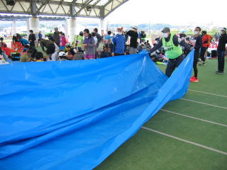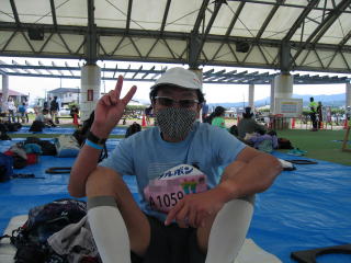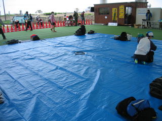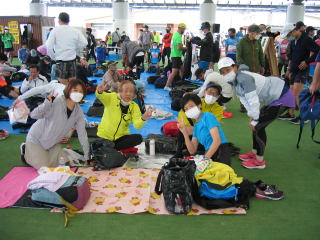 ブルーシートは荷物置き場で、休憩場所にしない様アナウンスが流れますが、たぶんそんなことは無理です、大会側、諦めたのかブルーシートを追加しています。