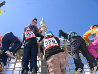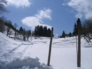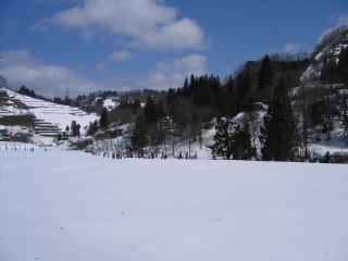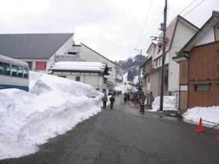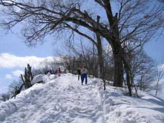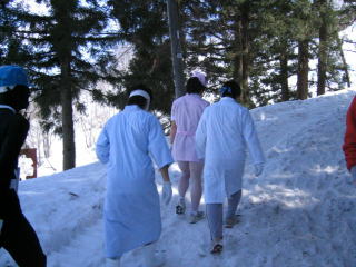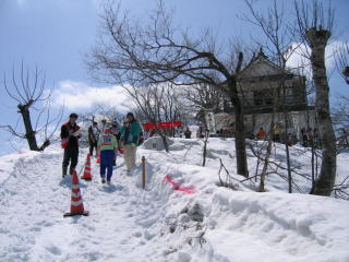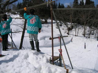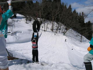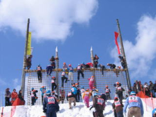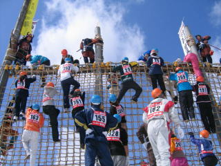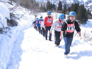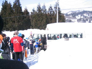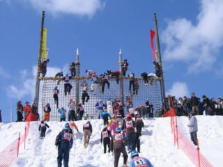 最初の関門「馬おとし」、背の高さほどある雪の壁を登りますが、一人では無理です。