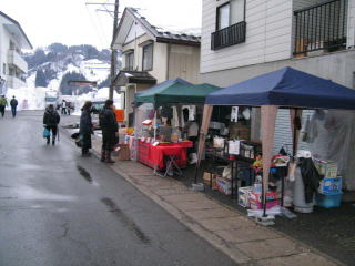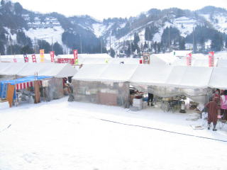 体育館から外をのぞくと「食い倒れ市場」のテントが見えます。