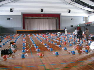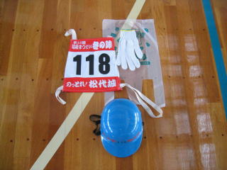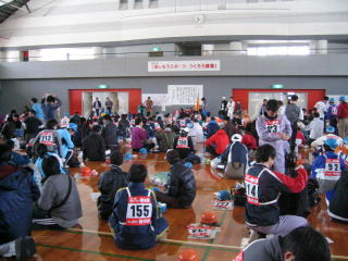 体育館一面の大量のヘルメット、厳しい「雪中鉄人レース」を予感させます。