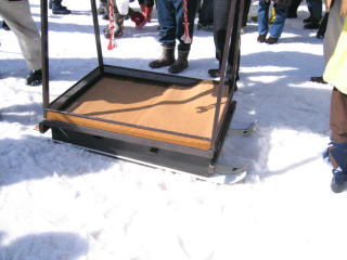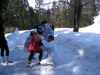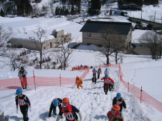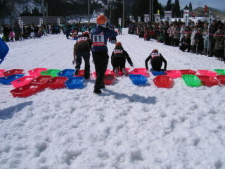 子供用のソリに乗って手で雪をかいて進む「堀越え」です。