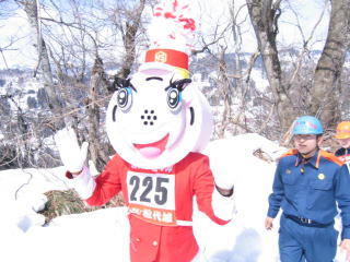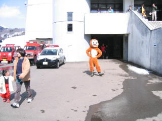 上越市消防隊の「住警(じゅうけい)君」、家庭用住宅警報機の設置をアピールです。