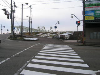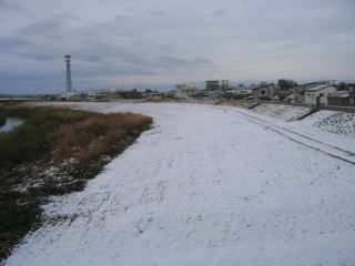 信濃川河岸の内側のり面には、昨日の雪が積もっています。