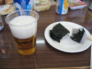 ほとんどのメンバーが揃っていますが、全員揃うまで、おにぎりとビールで待ちます。