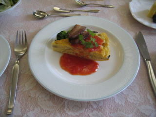 メインは卵料理、サラダ、デザート、りんごジュース、ヨーグルト、パン、コーヒーです。