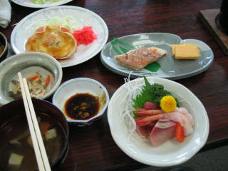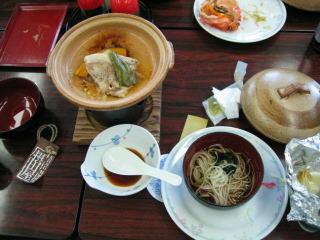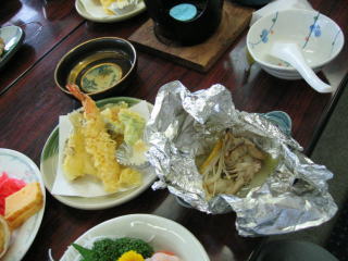お料理はお造り、てんぷら、焼き魚、蟹グラタン、ホタテとエノキのホイル焼きなど、豪華です。