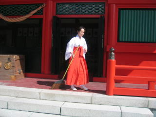 綺麗な巫女さんがお掃除中、ご苦労様です。