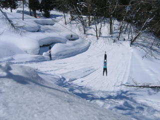 ワイヤーに掛けたタイヤにぶら下がって下ります。