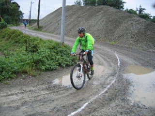 ドロドロの右コーナーを曲がり、信濃川堤防上道路へ向かいます。