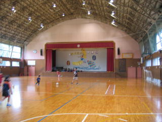与板小学校体育館で荷物を受け取り、タオルで汗と雨を拭いて着替えます。