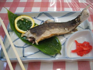 リキさんと待ち合わせして、「もとき亭」さんで「お切込うどん」、「いわな炭火焼」をいただきます。