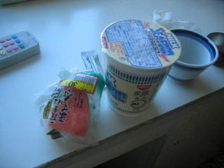おにぎり2個とカップヌードルミルクシーフードです。