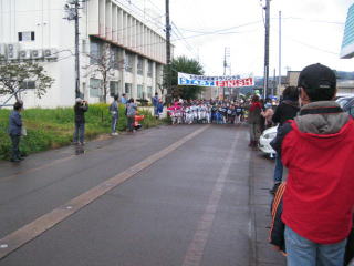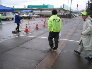 スタートしました、雨で滑りやすそう、転倒に気をつけて下さい。
