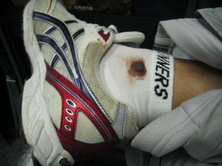 今回も左足で右足くるぶしを何回か蹴って血だらけです。