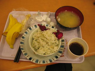 だいぶ時間を前倒しして朝食が始まりました、自分でよそってご飯を大盛でいただきます。
