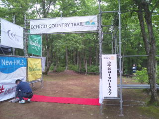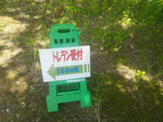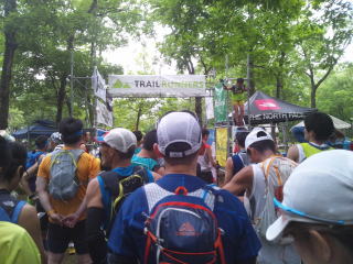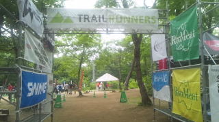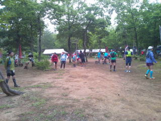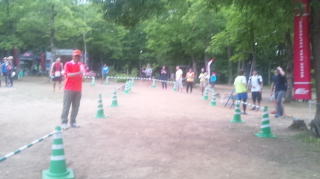 荷物置き場に戻り、上着を脱いでトレランシューズを履いて用意完了、下見したスタートゲートのあるバーベキュー広場奥へ向かいます。