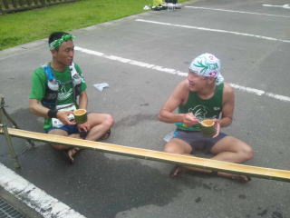 座り込んで、本腰を入れて流しそうめんを味わっているランナーもいます。
