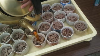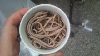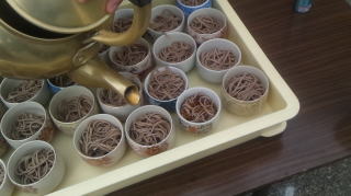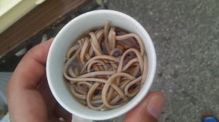 だんごやきゅうりをいただいて出発しようとしたら、ちょうど「おそばが茹で上がった」とのことでいただきます。