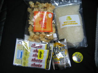 いただいた参加賞、おかき、お米、ショットパウダー、ゼリー、カンバッジです。