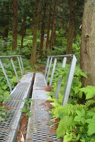 鉄の橋の奥の林の中を走って(歩いて)いる小さな後ろ姿が姫ちゅです。