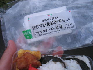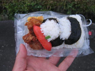 お昼12時半頃、C駐車場の隅で、気温が高く痛まない様、保冷剤と保存の指示が出ていた「ボランティアお弁当」をこっそりといただきます。