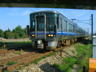 高架の下の踏切、電車がきました。