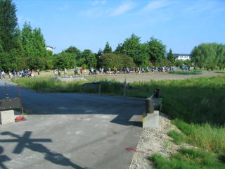 この踏切付近で大型バスが止まり、ランナーがたくさん降りてきます。
