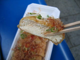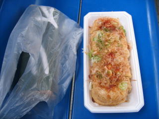 大きくて熱々揚げたて、ねぎと削り節が乗っています。
