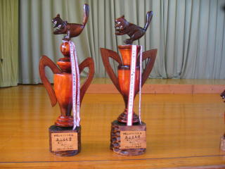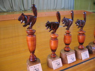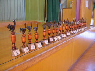 面白いトロフィーがたくさん並べてあります。
