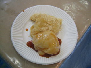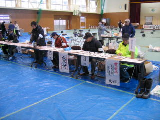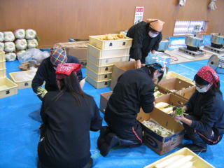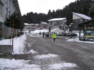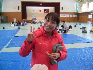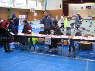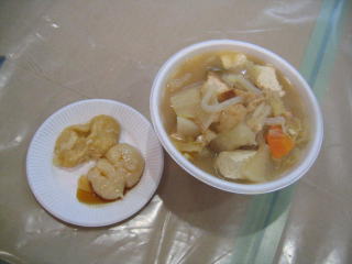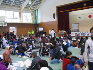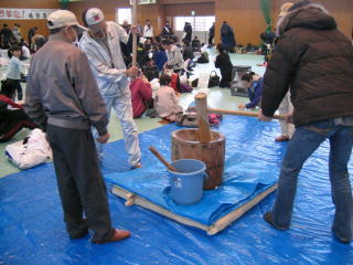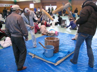 体育館まで戻り、寒いので急いで着替え、暖かいとん汁、つきたてのお餅をいただきました。