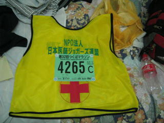 日医ビブス、ランパンランシャツ、軍手、携帯と飴を入れたウエストポーチといった出で立ちで出走します。