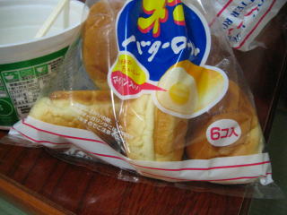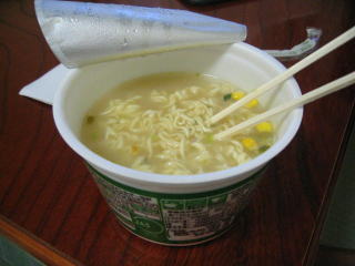 朝食は前夜買ったカップ麺とバターロール2個です。