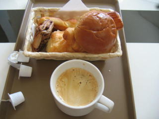 朝は6時50分に起きて、フロントで7時からの無料のパン&コーヒーをいただいて朝食です。