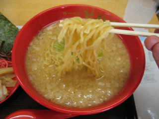 麺は中太麺、透き通った麺です、背脂たっぷりのしょっぱい醤油トンコツといった感じです。
