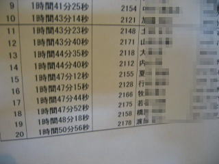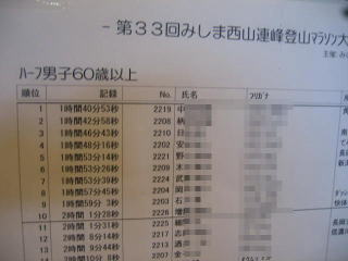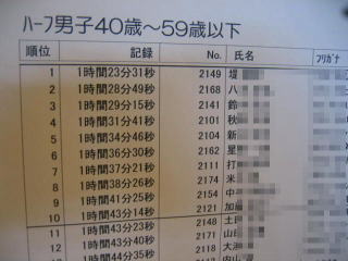 上位の記録が掲示されています、ハーフ男子40歳〜59歳以下では黒豹さんが4位です、スカイさんは16位です。
