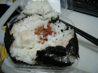 夜食にジャンボおにぎりをいただきました、具は梅でした、美味しかったです。