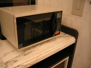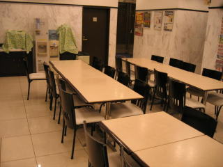 ホテルの朝食会場、電子レンジ、パソコン2台ありました。