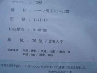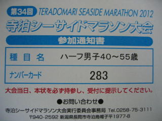 平成24年10月21日 長岡市の「第34回寺泊シーサイドマラソン大会2012」のハーフに参加しました。