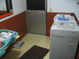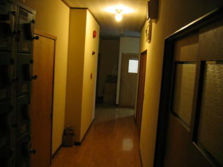 1階奥には共同トイレ、その右手に洗面所、左手には今夜の部屋、かび臭いが8畳です。