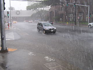 真っ暗でどしゃ降りの雨の中を道路の段差などに気をつけ、水溜りを避けながら走ります。