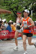 黒いランパンランシャツは新潟ローカルTV主催のnaoさんのチーム、完走アナウンサーがランナーを取材しているところを取材します。