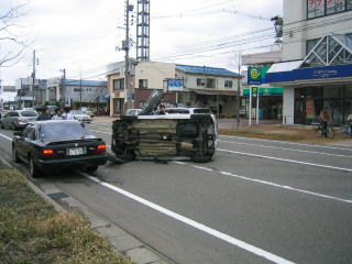 左側の黒い車の右後方に、銀色の軽自動車の左前部から追突、勢いで転倒したようです。