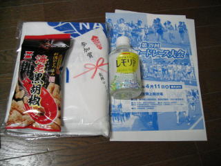 ナンバーカード、大会要綱参加者名簿、参加賞などをもらいました。
