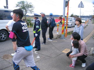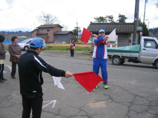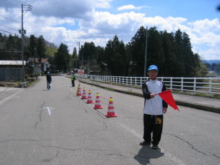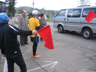 聞けば(スタートから?あるいはトップ通過後?)7分経過したので一般車を通すためランナーは通行止めとのことです。