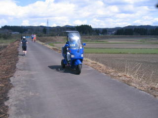 先導車は三輪?スクーターです、さすがにこの道幅では車は無理でしょう。