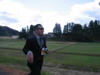 え!サラリーマン、ランニングシューズを履いた走るサラリーマンです、仮装なのでしょう。
