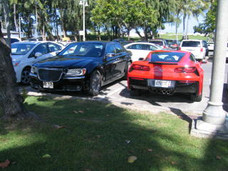 黒いのはクライスラー新型300、赤いのはシボレーコルベットかな。