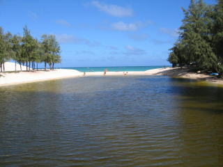 以前来た時は川は海に注いでいましたが、水量が少ないせいか堰き止っていて水はよどんでいます。