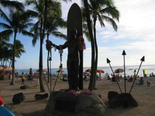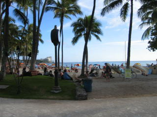 ワイキキビーチの時計とデュークカハナモク像です。