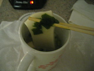 電子レンジで暖めたお餅を味噌汁にi入れてカーボ追加、お餅は日本から持ってきました。
